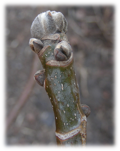 Який з наведених видів має зеленувато-бурі потовщені пагони, з білими сочевичками та великим слідом листкового рубця?