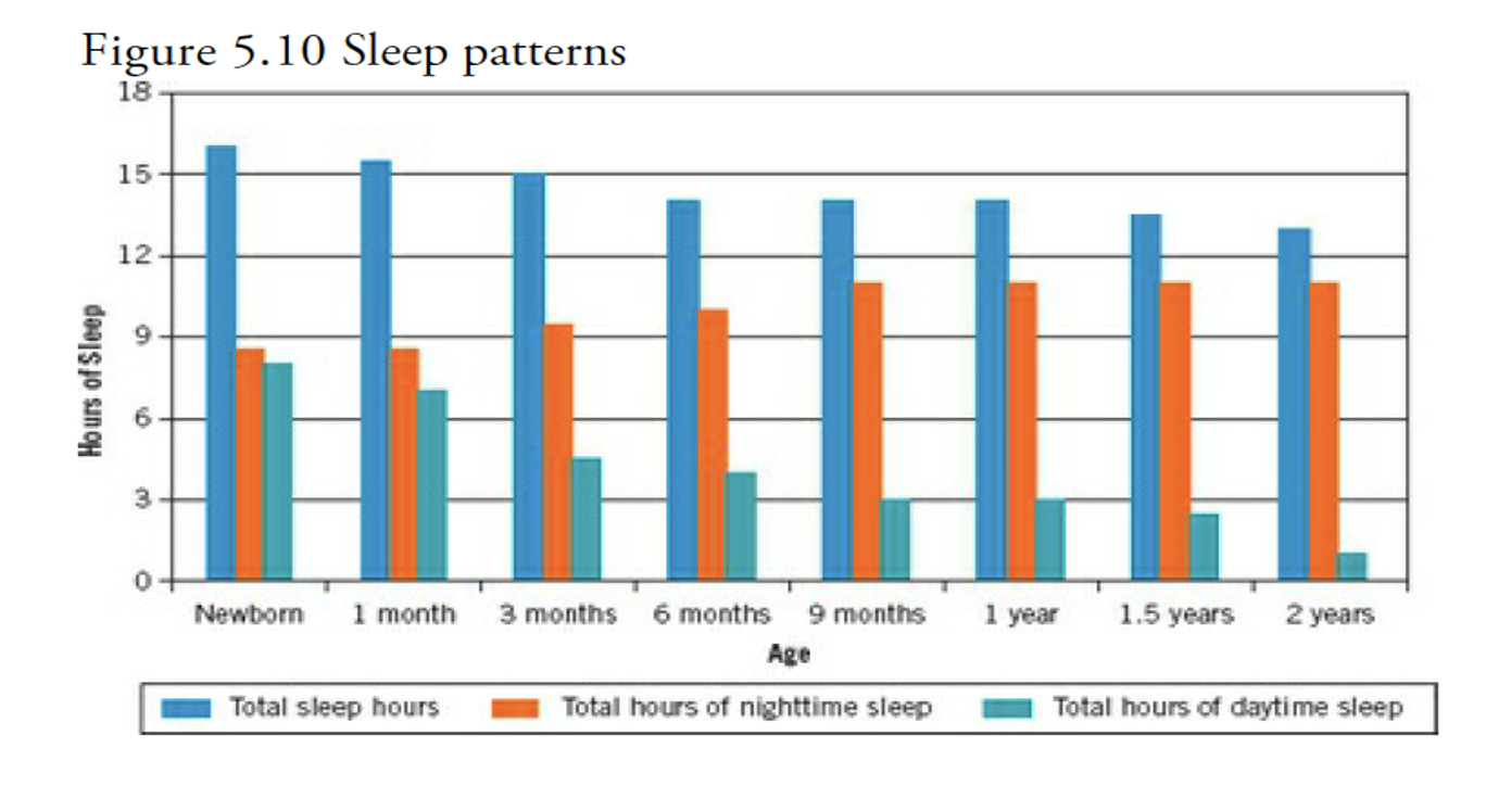 La gráfica muestra los patrones de sueño en la infancia, desde el nacimiento hasta los dos años, incluyendo el total de horas de sueño, las horas de sueño nocturno y las horas de sueño diurno. Según esta información, ¿cuál de las siguientes afirmaciones es correcta?