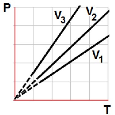 El gràfic representa tres línies isocores per un gas ideal. Quin dels següents és cert sobre el volum del gas?
