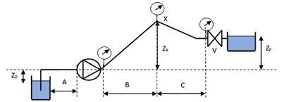 Por la instalación de la figura circula agua (ρ=1000 kg/, μ=0,001 Pa s, psat= 5000 Pa). Los tubos tienen un diámetro interior de 170 mm y una rugosidad de 0’3 mm. Las longitudes de los tramos son: LA=10 m, LB=900 m y LC=1000 m y los coeficientes de pérdidas en los accesorios para cada tramo son ∑KA=3, ∑KB=10 y ∑KC=10. Las cotas Z0 y ZF son, respectivamente, -3 m y 30 m.