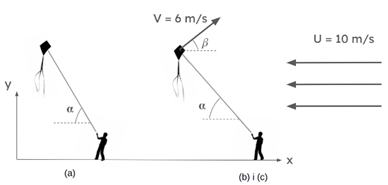 Calcula la tensión en el hilo, en N, necesaria para desplazar la cometa a velocidad uniforme V = 6 m/s con 𝛽 = 60º tal y como se muestra en la figura anterior