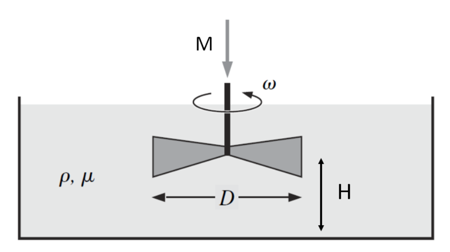 Encuentra la relación funcional adimensional que relaciona la dependencia funcional del par M que debe aplicarse para que la turbina agitadora gire a velocidad constante en el seno de un fluido de densidad ρ y viscosidad μ