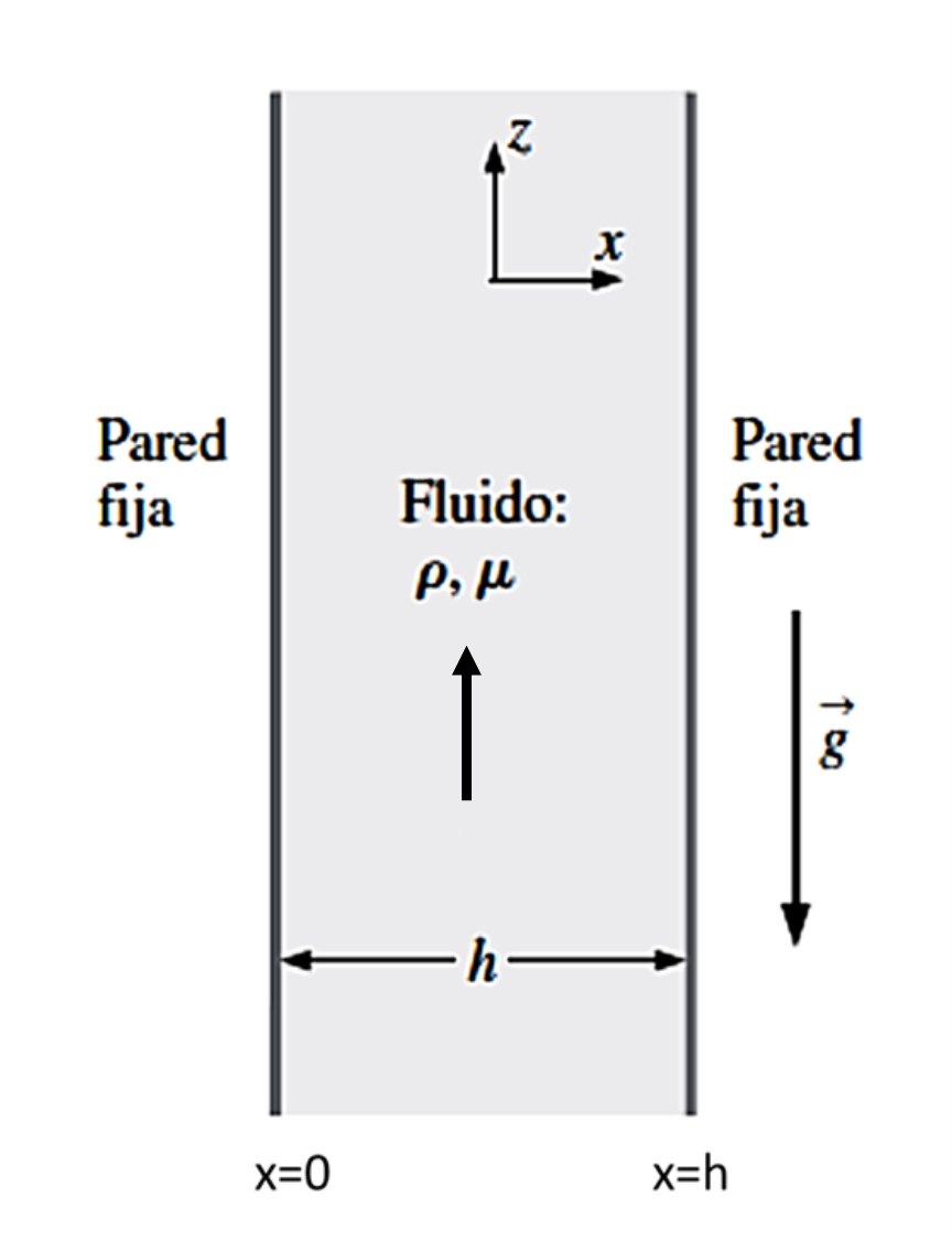 De acuerdo con la figura adjunta, entre las dos placas paralelas hay establecido un flujo ascendente, incompresible, estacionario, completamente desarrollado y laminar de un fluido newtoniano debido a la acción de un gradiente de presiones que actúa en contra del campo gravitatorio.