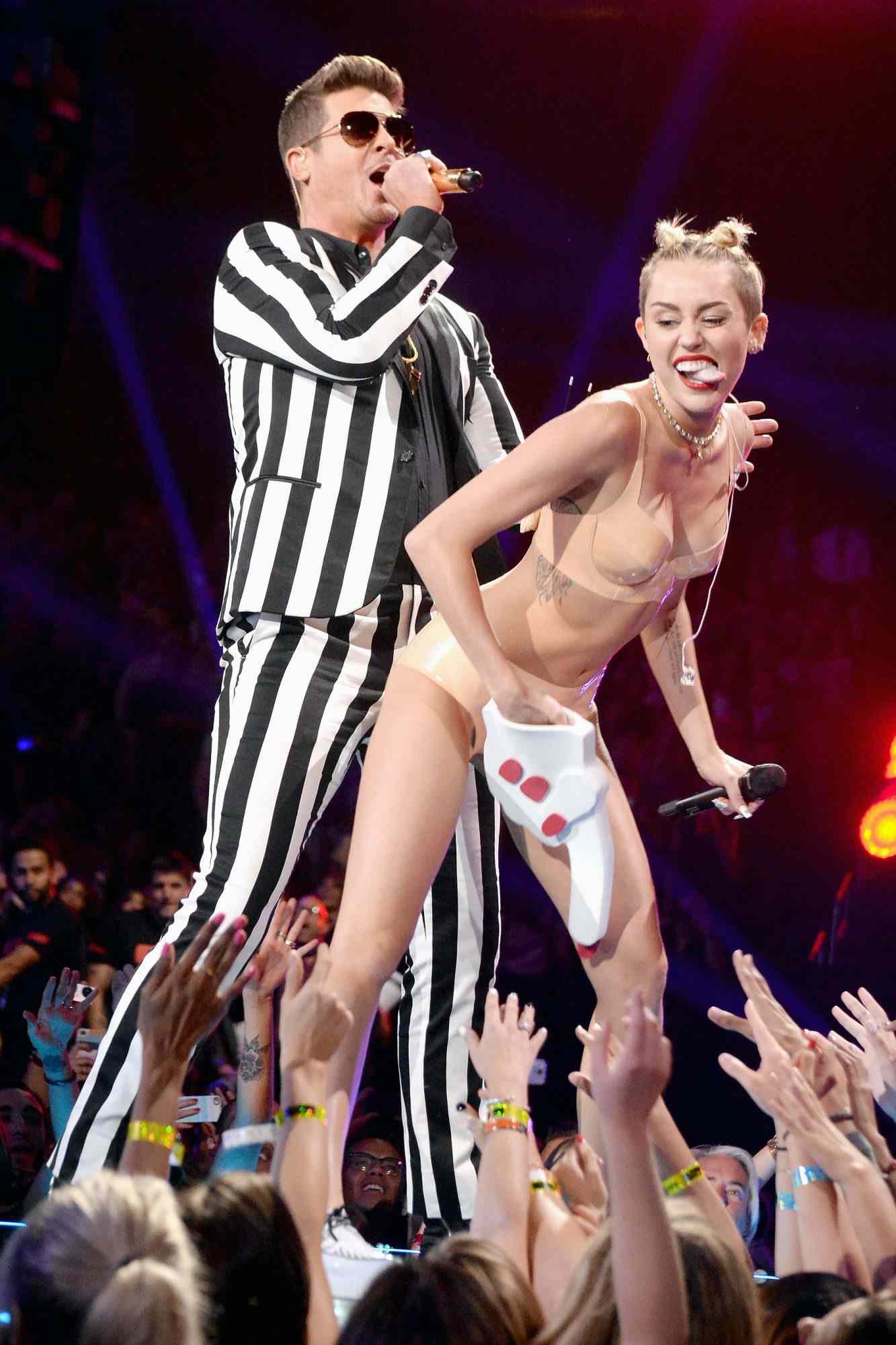 En los VMAs del año 2013, , realizó un performance de su canción We Can’t Stop. Al terminar su bizarra interpretación, un cantante (ahora desconocido) llamado Robin Thicke, entró al escenario. Al rato, re-aparece Miley vistiendo un conjunto que simulaba un nude illusion, con un guante en la mano derecha y le realiza un cuestionable twerking mientras mostraba su lengua (se adjunta foto).