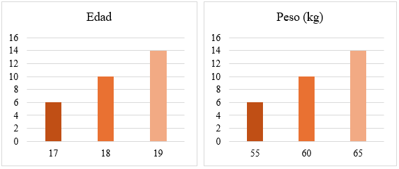 En un grupo de estudiantes de primer semestre se tomaron datos de edad y peso. El peso promedio es de 60 kg, siendo lo deseable 65 kg. Bienestar Universitario interviene durante tres meses a los estudiantes y de nuevo se hacen mediciones teniendo los siguientes registros