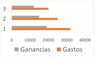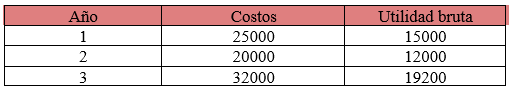 ¿Cuál es la representación gráfica de la utilidad bruta en función de los costos entre los 3 primeros años?