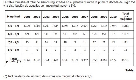 El promedio anual de sismos en la primera década del siglo XXI fue 3.783. Los años con el número de sismos más cercano y más lejano al promedio son: