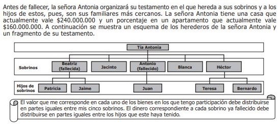 Patricia está muy contenta, pues afirma que, de la forma en que su tía repartió el dinero de sus bines, ella obtendrá más dinero que si la herencia se dividiera en partes iguales entre los familiares vivos de la tía según el esquema. La información de Patricia es: