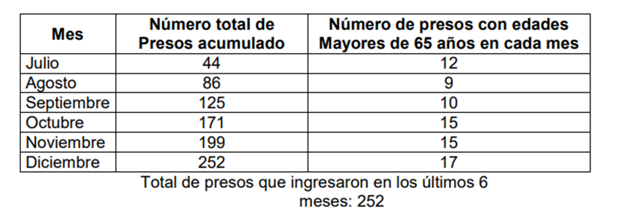 El director de la cárcel para hombres, presenta un informe sobre el número de presos que han ingresado a esta cárcel desde el mes de Julio y cuántos de ellos son mayores de 65 años, ya que según el reglamento si un preso es mayor de 65 años y tiene una enfermedad terminal obtiene la casa por cárcel.
