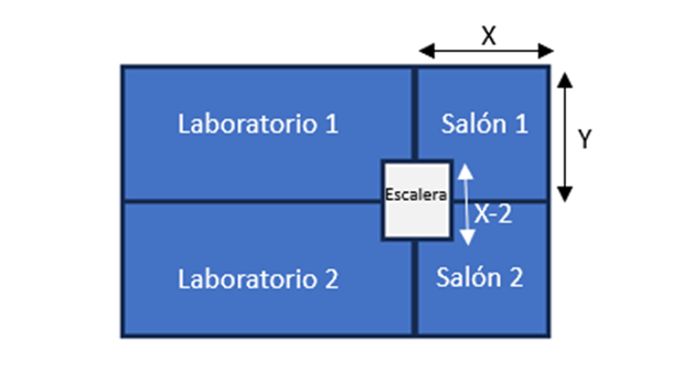 En la figura se presenta el plano de los salones de clase en la Universidad, conformado por dos laboratorios de igual medida, 2 salones de que miden la mitad del área los laboratorios y comparten un espacio común de forma cuadrada donde se encuentra la escalera