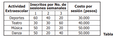 Un colegio registra la cantidad de inscritos por cada curso extraescolar que ofrece, según el