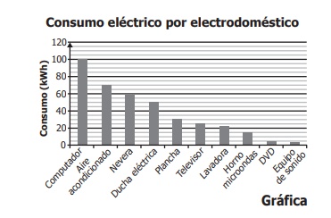 La gráfica muestra el consumo eléctrico promedio mensual (en kilowatts-hora) de algunos electrodomésticos de uso frecuente en el hogar.