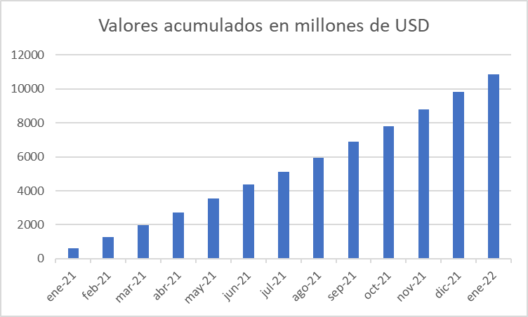 En el año 2021, las ventas de productos colombianos a Canadá eran de $630 millones de USD a enero del 2021, pero debido al incremento de las ventas y mayores precios en enero del 2022 estos superaron los $1.038 millones de USD. La grafica muestra las ventas acumuladas en millones de dólares desde el año 2021 al 2022