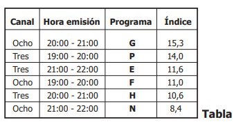 El índice de audiencia indica la popularidad de un programa de televisión. El índice está relaciona- do directamente con el tiempo que los hogares ven el programa. Es decir, si un programa tiene 100 puntos en el índice, esto equivale a que los hogares que se tomaron en la muestra vieron los 60 minutos que dura el programa. En la tabla se muestran los índices de algunos programas, el canal al que pertenecen y la hora de emisión de un país. Este país tiene 4 canales nacionales.