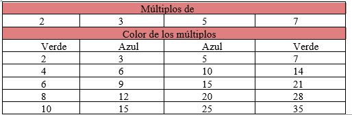 Un estudiante en clase de matemáticas utiliza la siguiente tabla de múltiplos de cuatro números y les asigna colores.