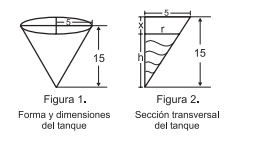 En una industria construyen un tanque de forma cónica de radio 5 dm y altura 15 dm, para el almacenamiento de agua, pero por una falla en su construcción pierde agua a razón de 1 dm3 por minuto.