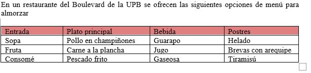 Si un estudiante desea comer carne a la plancha y tiramisú, independiente de la entrada y la bebida, las opciones que tiene para su almuerzo son