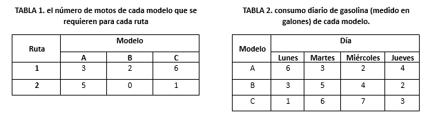 Una empresa de encomiendas de zapatos cuenta con motos de tres modelos distintos para cubrir dos rutas en una ciudad colombiana durante los días lunes a jueves. En la tabla 1 se muestra el número de motos de cada modelo que se requieren para cada ruta y en la tabla 2 se muestra el consumo diario de gasolina (medido en galones) de cada modelo.