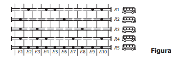 Un sistema de transporte masivo tiene varias estaciones (E1, E2…) sobre una avenida. En condiciones normales, entre dos estaciones consecutivas, un bus se demora 4 minutos y en cada parada, 30 segundos. En la figura, los círculos sombreados representan las paradas de cada ruta (R1, R2...).
