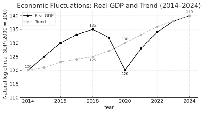 The figure shows the natural log of real GDP (solid black line) and its trend (dashed gray line) between 2014 and 2024.  Which of the following statements is correct?