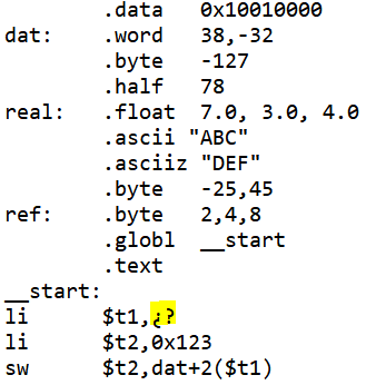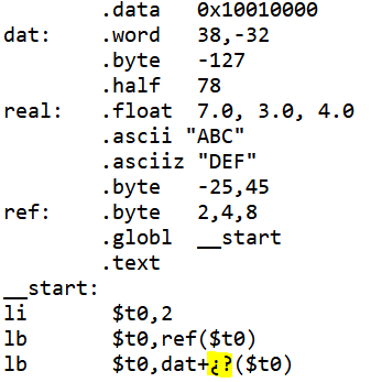 Dado el siguiente código, seleccionar el valor numérico con el que reemplazar ¿? para que el programa cargue el ascii "C" en el registro $t0.