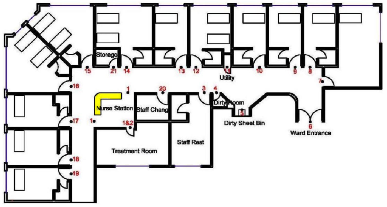 A sota tens el pla estructural de la unitat. Hi ha 12 habitacions (del número 7 al 19 excepte l'11). El número 1 (en groc) indica la ubicació del control d'infermeria. Considerant el risc de caigudes del pacient i el fet que de 17h a 20h el pacient es queda sense acompanyant, quines de les habitacions seria ideal per prevenir riscos? (Considera tant la localització com el número de llits que té)