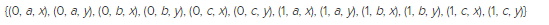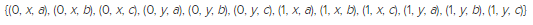 Let A={a,b,c}; B={x,y} and C={0,1}