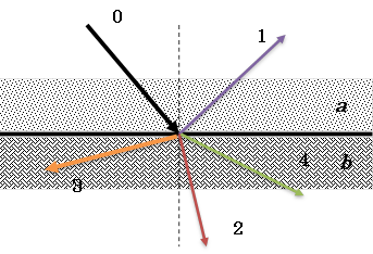 Якщо світло переходить з менш оптично густого середовища a в більш густе b, то який з наведених променів буде відповідати заломленому променю для падаючого променя?