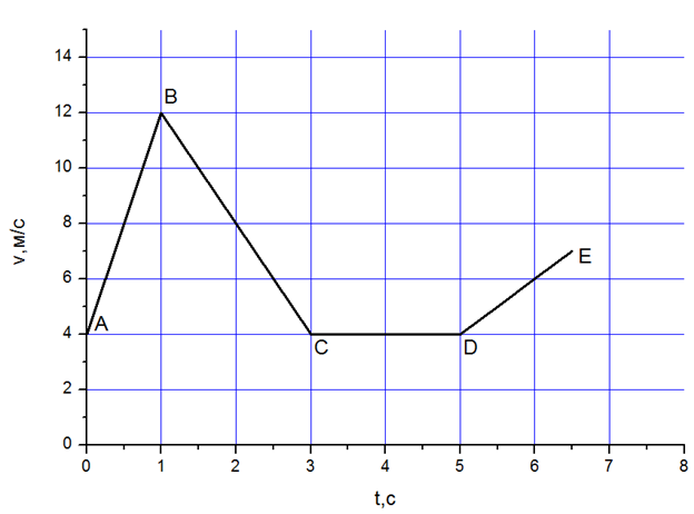 На рисунку подано графік залежності швидкості руху тіла вздовж осі Ох. Встановити відповідність між ділянкою руху та силою, що змушує тіло рухатися на певній ділянці за заданим законом зміни швидкості. Масу тіла прийняти рівною 3 кг.