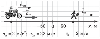 Використовуючи дані рисунка, визначте координату, в якій зустрінуться мотоцикліст та пішохід. Відповідь дати в метрах з точністю до цілих. Представити повне розв’язання задачі за правилами оформлення задач з фізики. Це розв’язання виконується власноруч на аркуші паперу. Надалі текст слід просканувати або сфотографувати та завантажити у вікно для відповідей.