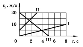 На графіку представлені залежності швидкості від часу для трьох тіл. Встановіть відповідність між номером тіла та відстанню, що воно пройде за 4 с?