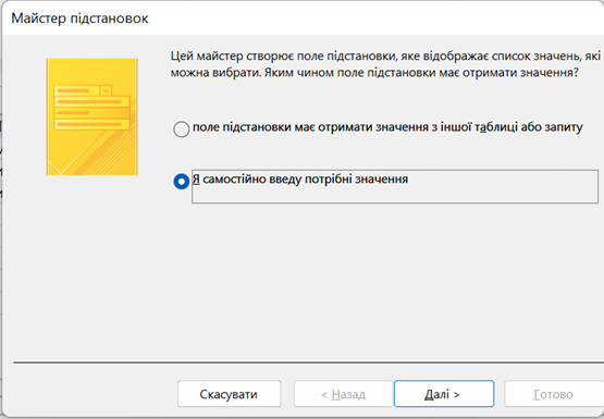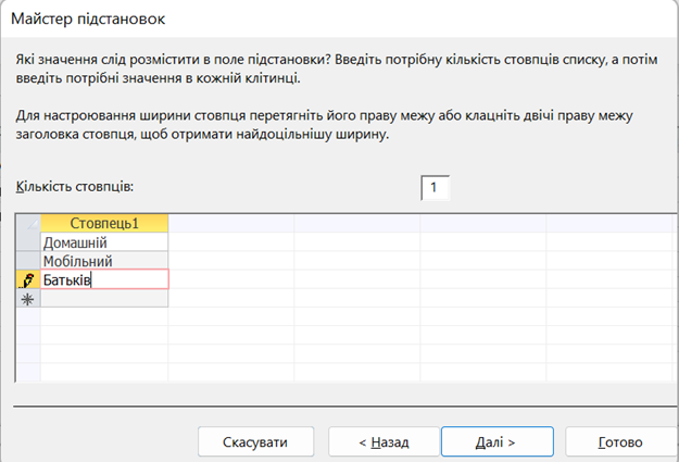 10. Формат поля Телефон задай такий: (###) ###-##-##. У конструкторі для типу поля Тип телефону увімкни майстра підстановки й задайте режим Я самостійно введу потрібні значення (рис. 4), натискай на кнопку Далі й уведи один стовпець із трьох значень: домашній, мобільний, батьків (рис. 5). Перейди в режим таблиці й заповни таблицю даними, яких бракує.