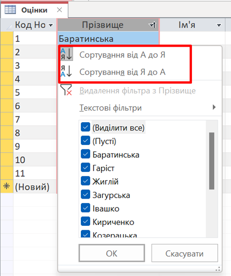 7. Упорядкуй уведені записи за зростанням значень деякого поля. Виокрем поле, клацнувши на назві, наприклад Прізвище, й натисни на стандартній панелі на кнопку Впорядкування (Сортування) за зростанням.