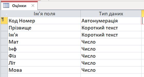 5. Закрий вікно конструктора таблиці й збережи структуру таблиці з деякою назвою, наприклад Оцінки.