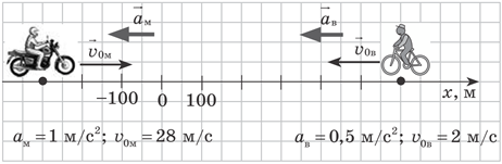 Використовуючи дані рисунка, визнач, через який час зустрінуться мотоцикліст і велосипедист. Відповідь надати в СІ, без уведення жодних розмірностей