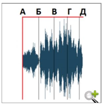 Розглянь фрагмент зображення звукової хвилі. В якій із точок (А–Д) звук має найменшу гучність?