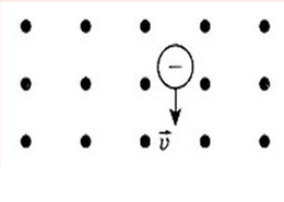Заряджена частинка рухається в магнітному полі зі швидкістю v. (Tочками вказано напрямок ліній магнітної індукції до читача.) Укажи, в якому напрямку відхилиться частка