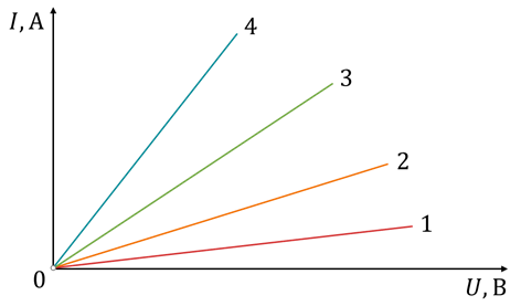 З вольт-амперної характеристики провідника, зображеної на рисунку, укажи, який з провідників має найменший опір