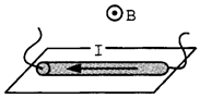 На поверхні столу знаходиться провідник масою 18 г, паралельно поверхні створено однорідне магнітне поле з індукцією 50 мТл, що має напрямок, як показано на рисунку. Довжина провідника 20 см. Якої сили струм треба пропустити по провіднику, щоб він почав підніматися над поверхнею столу? (g = 10 Н/кг)