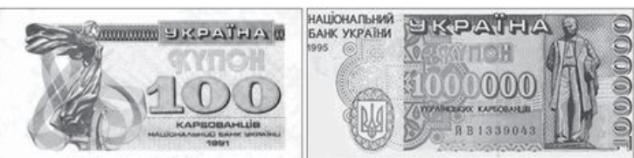 На фотографії зображено купюри максимального номіналу в 1991 р. і 1995 р. Укажи, що спричинило значне підвищення Національним банком України номіналу купоно-карбованців протягом 1991—1995 рр.