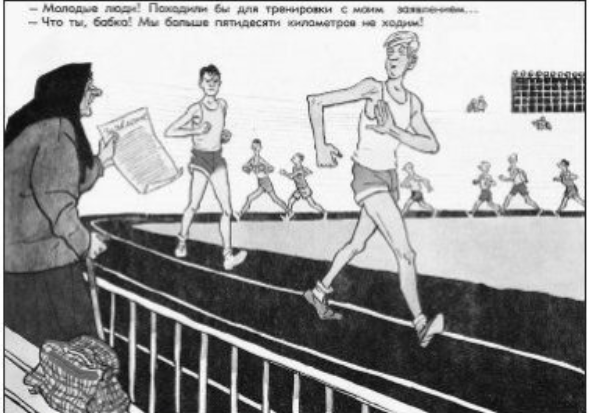 Напис на карикатурі:— Молоді люди! Походили б для тренування з моєю заявою...— Що ти, бабцю! Ми більше п’ятдесяти кілометрів не ходимо!