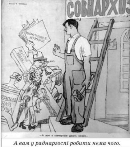 Укажи, коли в Українській РСР започатковано політику, на ідеологічній складовій якої зосереджує увагу зображена карикатура
