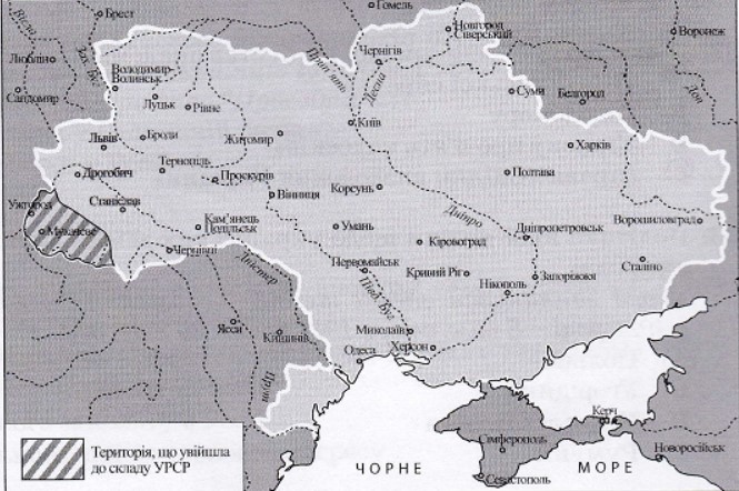 На картосхемі заштриховано територію, що увійшла до складу УРСР на підставі договору між СРСР і