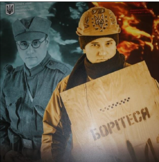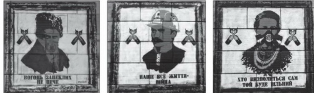 На фотографії зображено один із плакатів проєкту «Відважні: наші герої», що відтворював образи різних поколінь українців ХХ— ХХІ століть через реконструкцію революційної атрибутики та вбрання учасників подій.