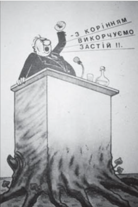 Укажи, коли в Українській РСР започатковано політику, на ідеологічній складовій якої зосереджує увагу зображена карикатура