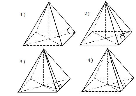 Дана довільна чотирикутна піраміда. Укажи малюнок, на якому зображений кут нахилу висоти піраміди до бічної грані