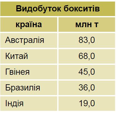 Розглянь таблицю країн-лідерів за сегментами глобального ланцюга доданої вартості в алюмінієвій промисловості (на 2017 р.). Увідповідни країни-лідери за видобутком бокситів із місцями, які вони посідають