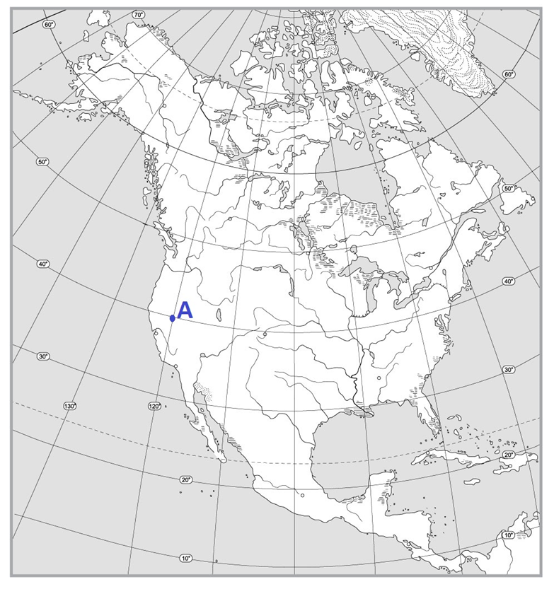 Укажи географічну широту точки А, що позначена на карті