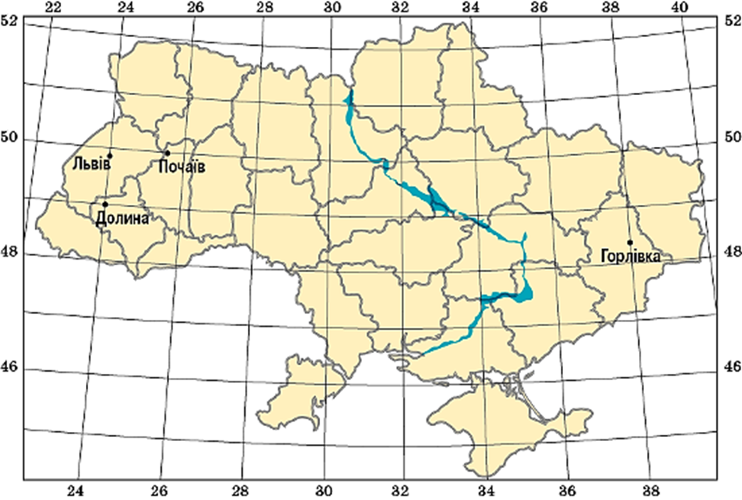 Укажи географічну широту міста Долина (у градусах)