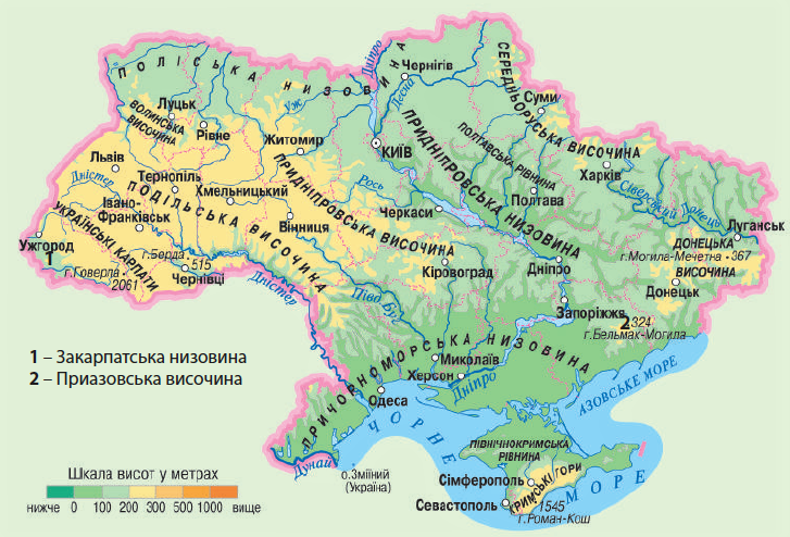 Розглянь фізичну карту України. Увідповідни назви форм рельєфу з їх розміщенням на території нашої держави